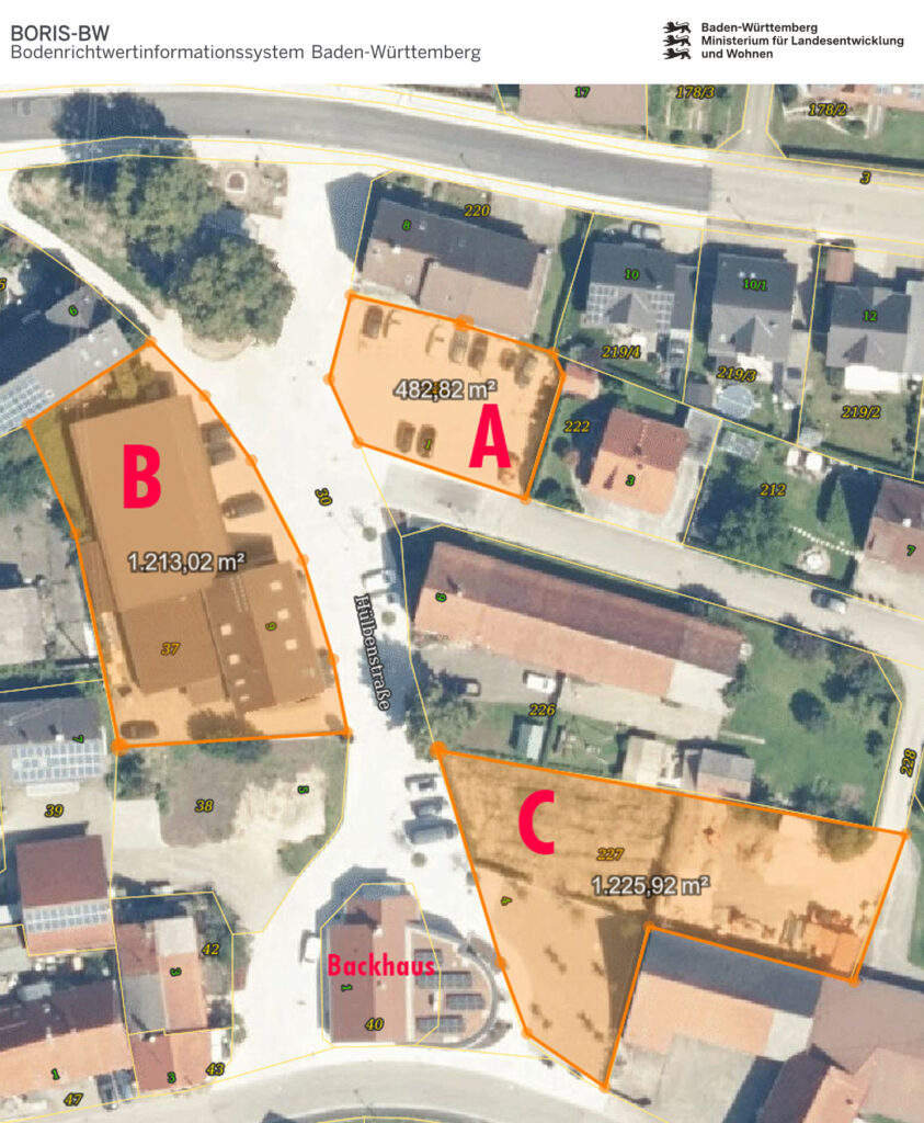 Wie Sie auf den folgenden Bildern sehen können, gehören der HGE ein Schotterparkplatz (A), ein Geschäftsgebäude mit Lagerhalle (B) und ein Grundstück, das zu 30% zum Vorplatz des Backhaus/Cafés umgestaltet wurde und ansonsten brach liegt (C).
